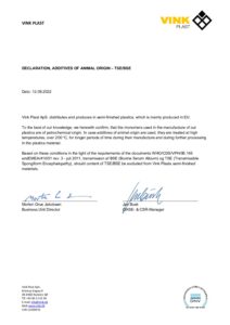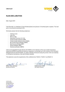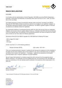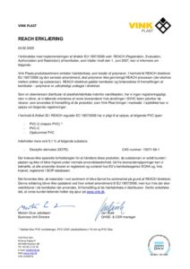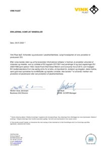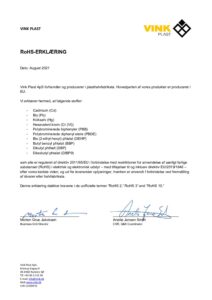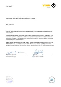 Når du handler med Vink Plast, får du en samarbejdspartner, der har dokumentation og overholdelse af lovgivningskrav som en topprioritet. Vi sørger for at være på forkant med alle myndighedskrav både nationale og internationale.