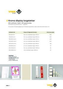 KROMA® Display Board er det perfekte karton materiale til skilteløsninger i top-kvalitet, hvor både pris, nem anvendelse og en grøn profil hænger sammen. Begge sider af pladen er er printbar, hvilket betyder at den er et godt alternativ til andre skilteplader. Den er stabil, hvilket gør den perfekt til hængbare skilte eller andre løsninger hvor nem håndtering, lav pris og/eller frekvent udskiftning er nøgleordene. KROMA® Display Board er FSC® certificeret når det leveres i hele pakker. Se shop.vink.dk for nærmere oversigt af sortimentet.