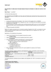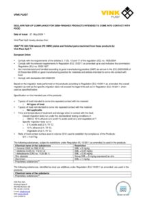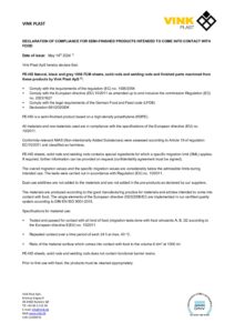 VINK® Aqua 340 er godkendt til direkte fødevarekontakt og leveres med Overensstemmelseserklæring, ligesom det leveres med en Overensstemmelseserklæring fra DHI som bevis på