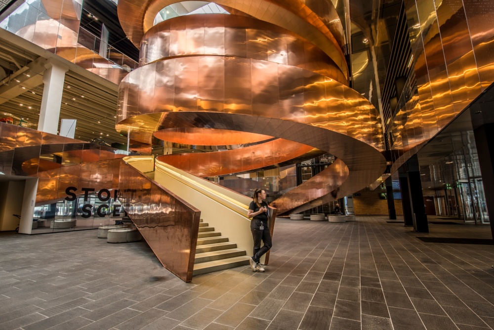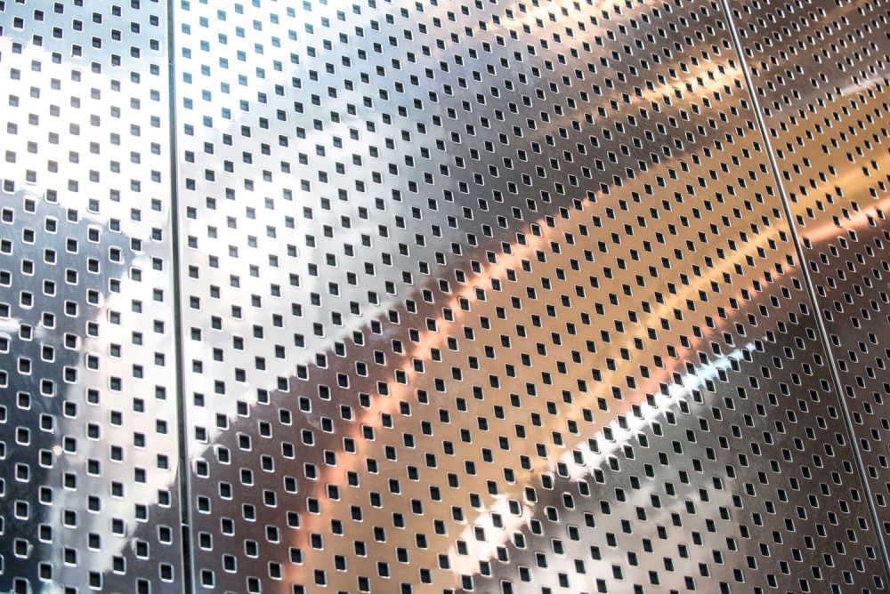Til projektet har Vink Plast leveret Larson® spejl-aluminiumssandwichplader, der giver spændede effekter på alle materialerne - og ikke mindst udstillingerne - i bygningerne. Særligt flot bliver det når pladerne reflekterer trappe ved indgangen.